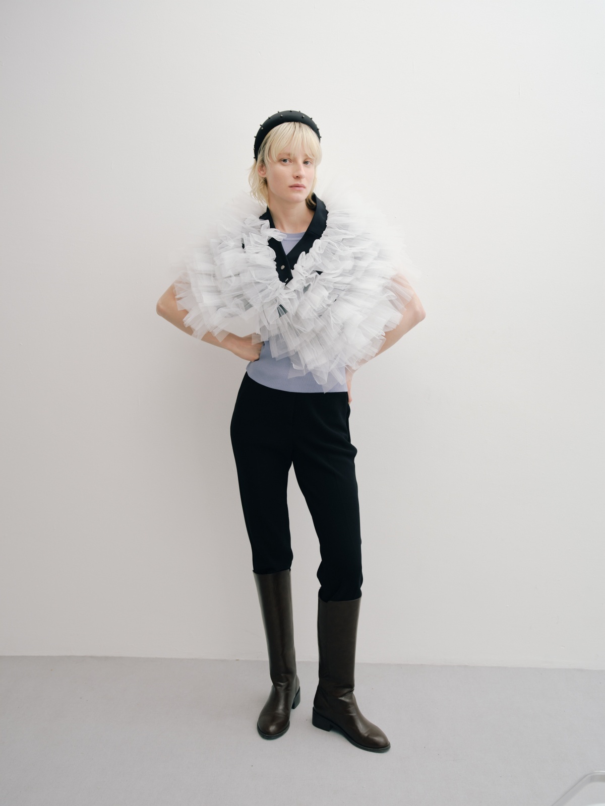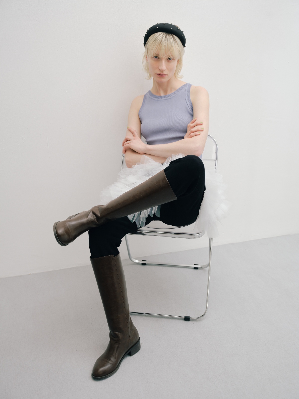ロングブーツとの相性も抜群で、スタイリングに抜け感とバランスをプラス。